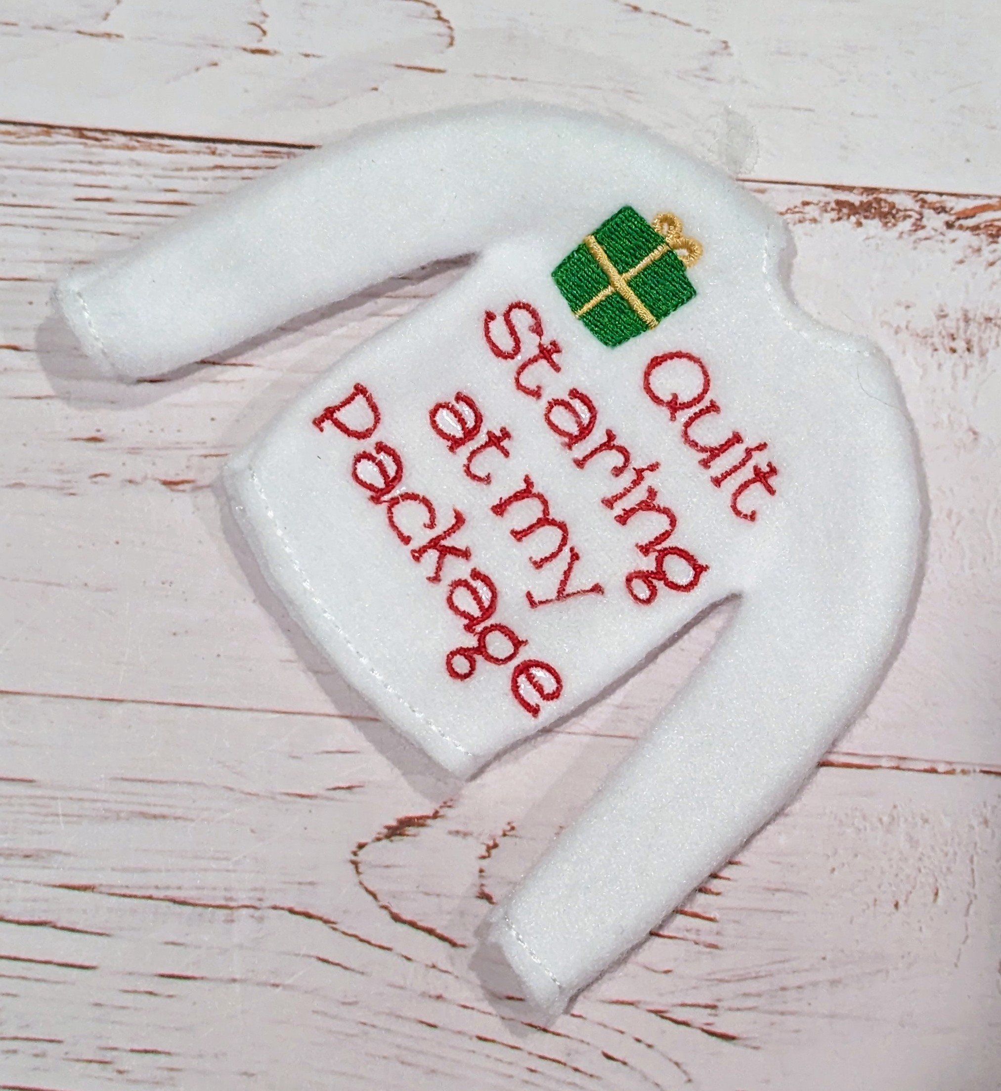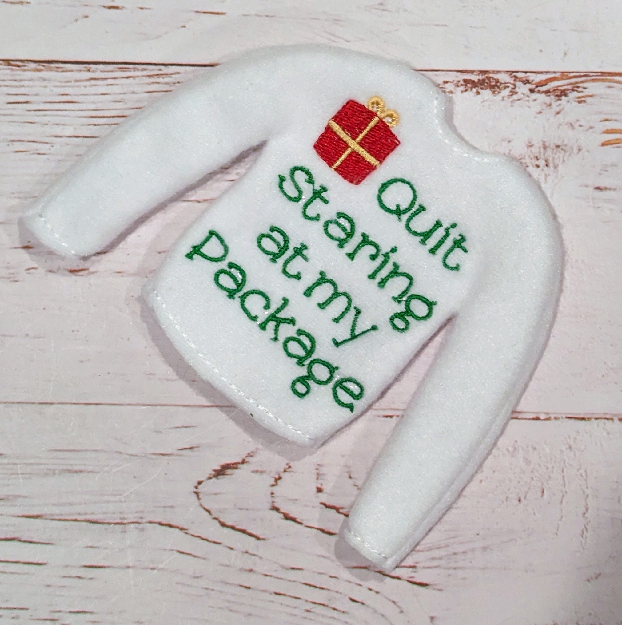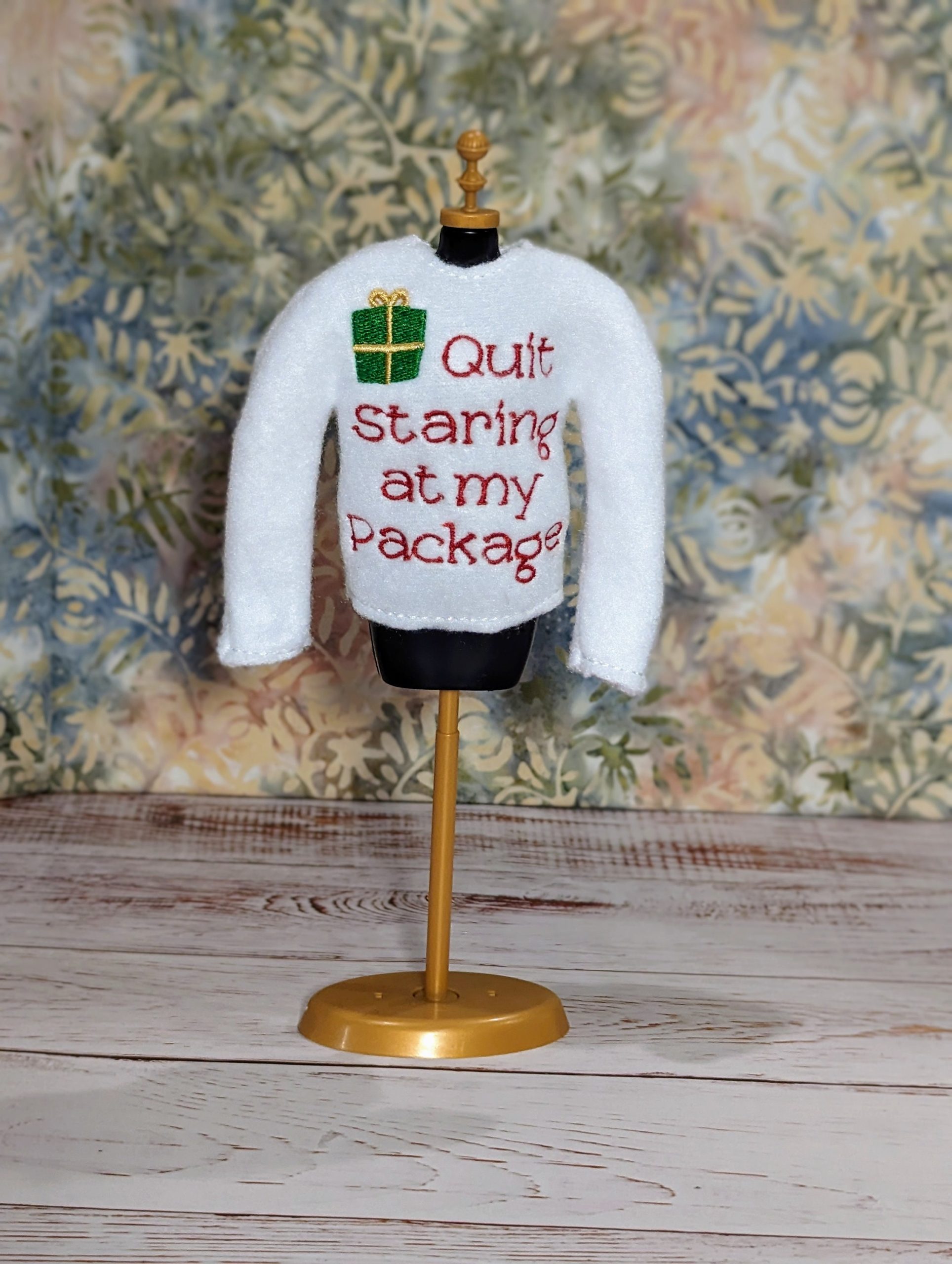 Designed to fit most standard elf dolls, our shirt boasts both comfort and style, creating the perfect canvas for imaginative play and heartwarming displays. Whether your elf is making a mischievous statement from a shelf, mingling with your holiday decor, or sparking laughter during family gatherings, the 'Quit Staring at My Package' Elf Shirt is a delightful conversation starter.